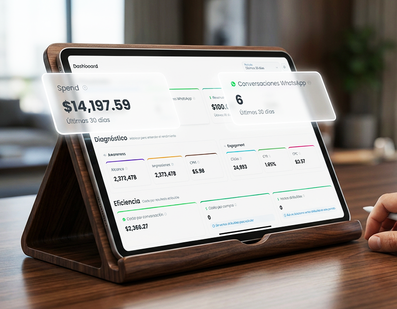 Unificamos tus anuncios de Meta con el cierre en WhatsApp para que visualices tu rentabilidad real y escales con datos exactos.