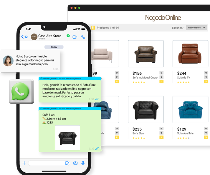 Sincroniza tu inventario, comparte productos en el chat, crea la orden de compra y envía el enlace de pago. La IA te ayuda a responder 24/7 y crecer tu negocio con nuestro CRM para Whatsapp.